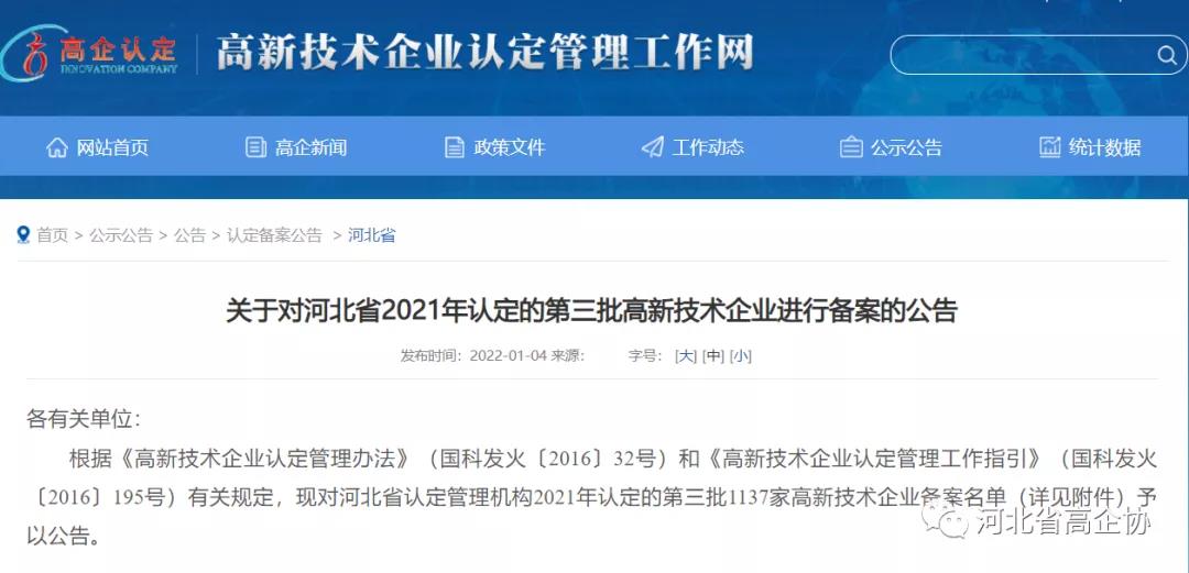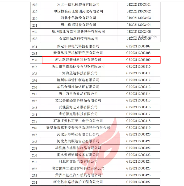 近日,河北省2021年认定第三批的高新技术企业备案公示名单出炉,河北路泽新材料科技有限公司成功认定为高新技术企业,这也是该公司在企业重要资质认定,品牌影响力、企业形象全面提升迈出的重要一步。